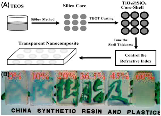 Li et al. [59] proposed an easy way to prepare a “highly” transparent polymer nanocomposite through the addition of core/shell nanoparticles projected to have a refractive index very close to the matrix one. Silica/titania core/shell nanoparticles were obtained through the hydrolysis of tetrabutyl orthotitanate (TBOT) continuously fed to a colloidal solution of silica Stober nanoparticles, as described in Figure 5. The highest transparency is observed at the 36.5 wt.% titania shell content.