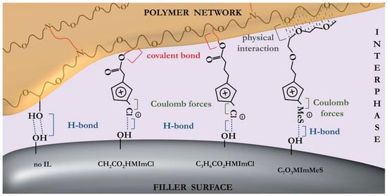 Representation of interaction between polymer network and filler surface beyond physical interactions; covalent bonds form thanks to reaction of carboxylic-ILs at the epoxy interface. Reprinted with permission from [86]. Copyright 2023 Royal Society of Chemistry.