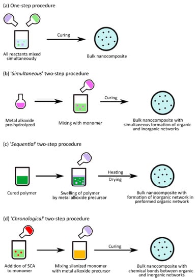 - A “simultaneous two-step” procedure: The silica precursor is first pre-hydrolyzed in a first step, then the monomer and the curing agent are added in order to build up both organic and inorganic networks.