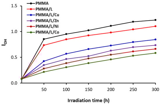 Thin films of PMMA were made and irradiated with UV light, and the FTIR spectra were recorded. The changes in the intensity of the peak corresponding to the stretching vibration of the OH group (3204 cm–1) were monitored [57] and compared to that of a reference peak (C–H or C–C). The increase in the intensity of the OH absorption band during irradiation reflected the degree of PMMA photodegradation. The IOH was calculated for each modified PMMA using Equation (1) and plotted against irradiation time (Figure 2).