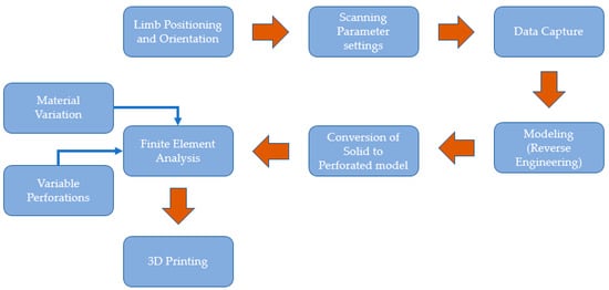 The methodology developed in this study (Figure 1) includes data collection, an RE design approach (or modeling technique), a numerical analysis process, and 3D printing. This study uses FE to assess several wrist splint designs based on perforation shapes, distributions, and materials. This section also includes technical directives to streamline the procedures associated with the established methodology. Various steps and techniques used during the development of the proposed approach for splint design and manufacturing using modeling tools are presented to address problems that arise at different phases.