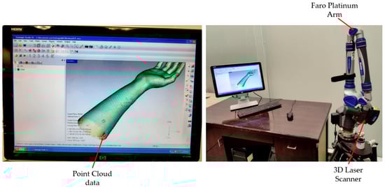 The 3D information gathered from the laser scanning equipment was inputted into the hand splint modeling process. The research team’s fit volunteer’s hand was leveraged to capture data. The acquisition of physical information on the participant’s limb constitutes one of the methodology’s essential steps. As shown in Figure 2, the scanning was performed with the Faro Platinum arm (FARO, Lake Mary, FL, USA). The individual’s Standard Tessellation Language (STL) file was obtained through 3D scanning to create the tailored splint utilizing the RE.