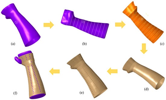 Modeling of the hand splint (a) Mesh of the hand (STL file); (b) Extraction of curves on the mesh; (c) Surface generated on curves; (d) Translation of surface to part model; (e) Conversion of the solid model into a perforated model; (f) Splint placed on the mesh.