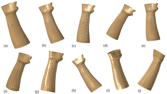 The perforations are constructed using a variety of shapes, including circular, square, triangular, elliptical, and hexagonal. In this particular work, the perforations’ distribution and shapes were both altered. The details of various designs, such as linear and round, are depicted in Table 1 and the splints were established with a 3 mm thickness. For example, Figure 5a illustrates the design with circular perforations and a linear/packed pattern (Design 1). Here, in Design 1, the perforations are dispersed linearly as well as packed in a particular area on the splint. Similarly, the perforations are dispersed evenly in a round and scattered pattern (with 30°/12) across the splint according to Design 3 (see Figure 5f). A 30°/12 denotes that there are twelve perforations at each level, all of which are at a 30° angle. Other designs and perforations in Figure 5b–j can be interpreted in a similar fashion. The dimensions used to create the various perforation forms were selected so that they all result in the same area (see Table 1).