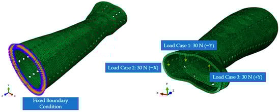 A structural input load of 30 N was imposed on the distal edge of the splint and patterned area along three directions independently to imitate possible traumas and pressures that could accidentally happen through the recuperation time []. The FE mesh, BCs, and load directions are shown in Figure 6.
