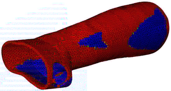 Before the topology optimization started, it was important to specify the places that must not be optimized (non-design space). Thus, in this study, for the topology optimization of the model, a 3 mm thick orthosis with the same BCs as the initial FE analysis of the perforated models was considered. The blue/green portions are those that the program recommends for material removal (soft elements), while the red regions are those that are indicated for surface retention (hard elements) (Figure 7). After topology optimization, the newly generated model was further put to examination using FE analysis. The loads, BCs, etc., which were needed to solve the optimization process are the same as those shown in Figure 6.