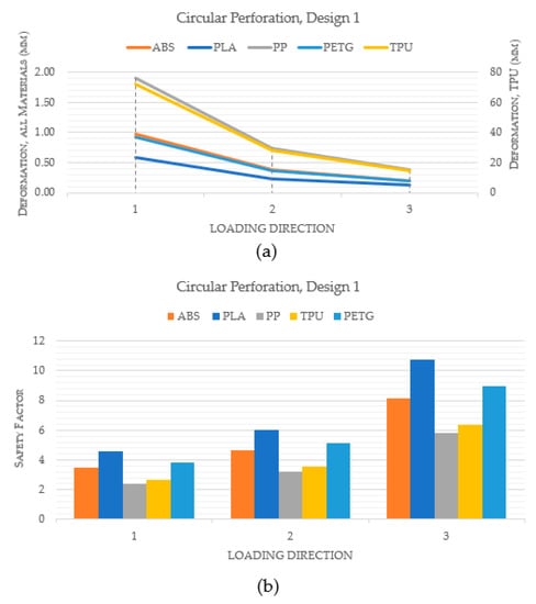Comparison of different materials with circular perforations and Design 1 (a) Deformation; (b) Safety factor.