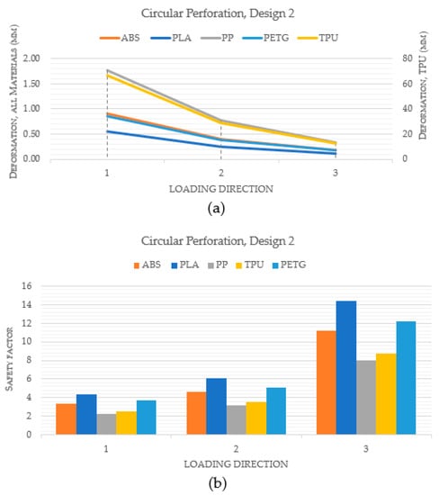 Figure 10 compares the performance of various materials for a hand splint with circular perforations and design 1, in which the holes are spaced equally apart by a linear pattern. Indeed, Figure 10a makes it clear that the PLA material exhibited the least deformation when compared to ABS, PP, TPU, and PETG. Additionally, it was noted that TPU deformed the most among the materials. Additionally, PLA had the highest safety factor across all loading directions, as shown in Figure 10b. This suggests that, in terms of stiffness and strength, PLA is the best material for hand splints. However, the materials were once more assessed in a similar way using design 2 where perforations are dispersed all over the hand splint, in order to further validate the results. Figure 11a demonstrates yet again that PLA had the smallest degree of deformation among all materials. Furthermore, Figure 11b illustrates that PLA had the greatest safety factor across all loading directions across all the materials.