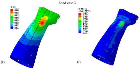 PLA 3 mm thick splint, circular perforation, Design 2 (a) Deformation under load direction 1; (b) Von Mises stress under load direction 1; (c) Deformation under load direction 2; (d) Von Mises stress under load direction 2; (e) Deformation under load direction 3; (f) Von Mises stress under load direction 3.