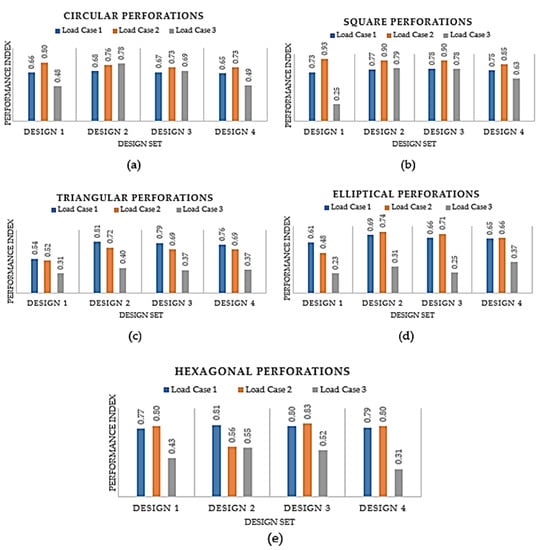 Performance Index of different designs corresponding to various perforation shapes (a) Circular; (b) Square; (c) Triangular; (d) Elliptical; (e) Hexagonal.