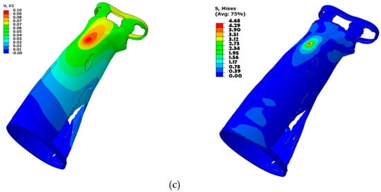 The second analysis compared various designs for PLA material that include different perforation shapes. The PLA material was chosen because the prior analysis determined that it was the most appropriate material. The PLA material had also been endorsed by numerous studies in the past for use in medical and other industrial products because of its superior characteristics and environmental friendliness [,,,]. Figure 12a–f displays the deformation and Von Mises stress for the PLA-based hand splint for Design 2 with circular perforations under three loading directions.