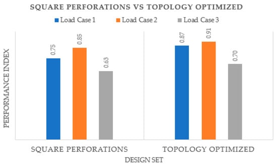The performance index (PI) was computed for various designs with correspondingly variable perforation shapes. It is particularly important to use the PI to compare the performance of each design to the solid model, which is assumed to have the highest safety factor and least deformation. The Equation (1) was used to calculate the PI. It implies that a design’s stiffness and resilience are superior when PI is higher.