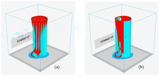 The STL file’s errors must first be fixed before the modeled splint can be produced. The triangles (in the triangulated polygon model) that are overlapping, intersecting, have twisted edges, and other issues can all be fixed with Magics®. The goal of this stage is to prepare the STL file for manufacture by identifying the appropriate location and alignment as well as building support structures wherever they are required. The proper supports are necessary to develop the prototype precisely while avoiding any irregularities. Additionally, they are imperative to prevent warping and for efficient heat transmission. In this investigation, the zigzag support pattern was employed as the support structure due to its expeditious printing speed, optimal equilibrium, and having the simplest removal process, as well as its efficacy to preserve the integrity of the 3D print. As demonstrated in Figure 8a, the INTAMSUITE slicing software (Version 3.6.2, INTAMSYS Technology Co., Ltd., Shanghai, China) was employed to slice, position, and create supports. The INTAMSYS (Intelligent Additive Manufacturing Systems) FUNMAT HT 3D printer (INTAMSYS Technology Co., Ltd., Shanghai, China) was deployed to produce the personalized hand splint (Figure 8b) [].