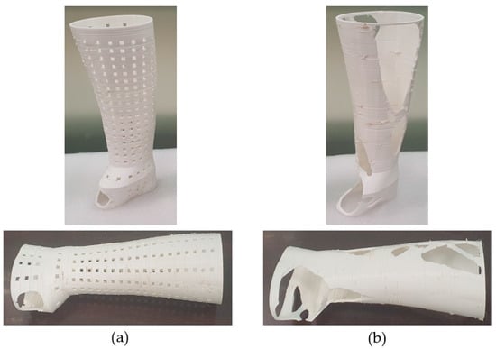 AM or 3D printing systems are a viable alternative methods for manufacturing these intricate orthopedic devices. They have opened up fresh possibilities for producing intricate shapes with undercuts or cavities and for minimizing waste []. The porous/perforated designs, or the topology optimization process and 3D printing, when integrated, allow professionals endless options and expand the range of potential solutions for the development and production procedure. The orthoses made by AM can give patients individualized rehabilitative tools, leading to a more appealing design, reduced weight, and reduced volume, as well as better airflow, all of which have a good effect on the patient’s usage of the product [,]. Additionally, it is critical to perform initial analyses on orthoses to estimate their strength and to confirm that the right material is being used and the perforations are suitable before producing on AM [].