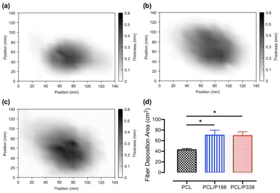 Representative temperature plots on fiber thickness of (a) PCL control, (b) PCL/P188, and (c) PCL/P338 groups. Scales are in mm. (d) Average fiber deposition areas of PCL control, PCL/P188, and PCL/P338 groups (n = 3). An asterisk between the groups indicates statistical significance (p < 0.05).