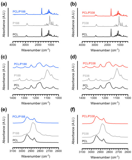 FTIR spectra of (a) PCL/P188 and (b) PCL/P338 fibers in comparison with PCL control fibers and poloxamer raw powders from 650 cm−1 to 4000 cm−1, (c) PCL/P188 and (d) PCL/P338 fibers in comparison with PCL control fibers and poloxamer raw powders in the finger print region, (e) PCL/P188 and (f) PCL/P338 fibers in comparison with PCL control fibers and poloxamer raw powders in the high-wavenumber region.