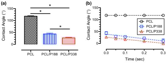 During the water contact angle measurements, PCL/P188 and PCL/P338 fiber mats continuously absorbed the water droplets over time. As a result, water absorption rates were determined from dynamic water contact angle measurements, as shown in Figure 4b. Results suggested that the PCL/P188 and PCL/P338 fibers mats exhibited a linear decrease in water contact angles over time. The slopes for the PCL/P188 and PCL/P338 groups were −95.7°/s and −85.3°/s, respectively. Our results were significantly greater than the reported values from the literature due to the differences between porous membranes and solid films [40,41]. In another study, dynamic water contact angle measurements using surfactants were measured on porous sponges, where various stages of surface wetting mechanisms were suggested [42]. The rate changes on the water contact angle, depending on the types of sponges used and the initial degree of water saturation on the sponges, ranged from 1.2°/s to 16.5°/s. The reported data were several-folds slower than the current electrospun PCL/poloxamer fiber mats, suggesting the importance of the pore size differences (e.g., 93~300 μm from the sponges) on the rate of water absorption. In general, time-dependent water contact angle measurements provided an alternative method to evaluate the water uptake ability in electrospun fibers.