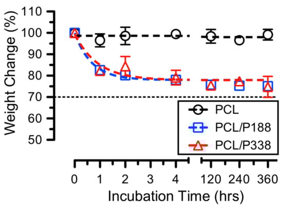 The average percentage weight changes in PCL/P188 and PCL/P338 fibers over time are shown in Figure 5. Since PCL required several years to fully degrade (t1/2 > 18 months) [44], it was anticipated that the average weight changes measured were primarily associated with dissolution of poloxamer in the PBS. In particular, PCL control fibers showed minimal weight changes (<3%) during the study (i.e., 15 days). For PCL/P188 and PCL/P338 fibers, results indicated average weight changes of 82.6 ± 1.7% and 82.2 ± 0.7% of the original weight after 1 h of incubation, respectively. The average weight changes in the PCL/P188 and PCL/P338 fibers continued to decrease to 78.1 ± 1.5% and 79.1 ± 3.4% of the original weights after 4 h of incubation, respectively. The rate constants (K), using one phase association curve fitting, suggested values of 2.2 and 1.9 from PCL/P188 and PCL/P338 fibers, respectively. These weight change values maintained to the end of the incubation time of 15 days for the investigation of this study. These findings indicated that poloxamers were capable of dissolving and/or diffusing out from PCL/poloxamer fibers within several hours.