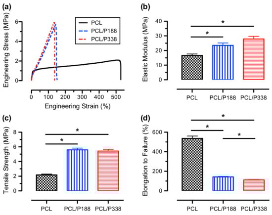 Mechanical properties of PCL control, PCL/P188, and PCL/P338 fibers, showing (a) representative stress–strain curves, (b) average elastic moduli, (c) average tensile strengths, and (d) average elongation to failure (n = 5). An asterisk between the groups indicates statistical significance (p < 0.05).