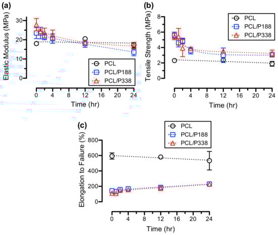 Similar to average elastic moduli, the average tensile strength, shown in Figure 7b, were found to decrease with increasing incubation time reaching to the average tensile strength of the PCL control fibers. The average tensile strength of the PCL/P188 and PCL/P338 fibers before incubation were 5.6 ± 0.4 MPa and 5.4 ± 0.4 MPa, respectively. After 24 h of incubation, the average tensile strength decreased to 3.1 ± 0.2 MPa and 3.2 ± 0.5 MPa for the PCL/P188 and PCL/P338 fibers, respectively. The average tensile strength of the PCL control fibers slightly decreased from 2.2 ± 0.2 MPa to 1.9 ± 0.3 MPa.