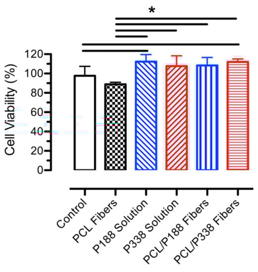 Confluent monolayers were exposed to treatment carriers of DMEM/F12 from Thermo Fisher Scientific (Waltham, MA, USA) as a negative control, PBS solution exposing to PCL blank fibers for 2 days, 40 µg/mL concentration of poloxamer/PBS solutions, and PBS solution exposing to PCL/poloxamer fibers for 2 days at 37 °C. The treatments were then replaced with fresh DMEM/F12 medium (500 µL/well) before the addition of 10 µL/well of MTT reagent. The cells were returned to incubator for 4 h at 37 °C with a 5% CO2 gas mixture. Metabolically active cells converted the tetrazole of the MTT reagent to purple formazan crystals. A 100 µL of the warm detergent solution was then added to each well, gently mixed, and left for two hours at room temperature in the dark. The supernatants were mixed gently and transferred to a 96-well plate for optical measurements using a Beckman Coulter AD340 plate reader (Brea, CA, USA) at 570 nm absorbance. The percentage of viable cells treated with the polymer extracts was calculated by referring to the carrier-treated control samples with assumed 100% viable cells (n = 5).