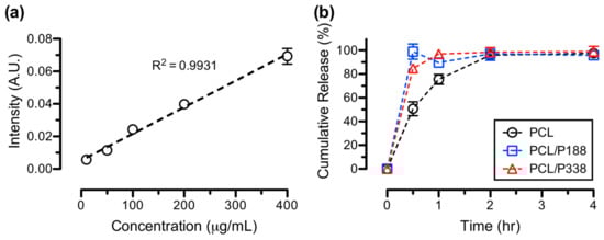 The in vitro release curves of IBP from the PCL control, PCL/P188, and PCL/P338 fibers are shown in Figure 9. After 0.5 h, the cumulative releases of IBP were 50.7 ± 5.8%, 98.9 ± 6.4%, and 84.8 ± 2.5% for PCL control, PCL/P188, and PCL/P338 fibers, respectively. Both PCL/P188 and PCL/P338 fibers reached complete release of IBP at 0.5 h time point and the IBP concentrations remained the same through 4 h of incubation in PBS. In contrast, cumulative IBP release gradually increased to 75.5 ± 4.1% and 95.9 ± 0.9% at 1 h and 2 h time points for PCL control fibers, respectively. Studies demonstrated the fast release characteristics of small molecule drugs after incorporation of poloxamer 407 in electrospun hydrophilic fibers, due to the surface wetting and improvement in dissolution of poorly water-soluble drugs [14,57]. In general, poloxamer promoted the wettability of hydrophobic PCL fibers to facilitate the release of small molecule model drugs.