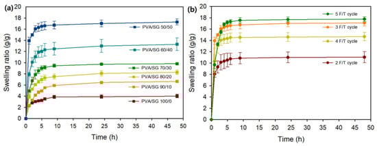 The swelling properties of the hydrogels with different SG contents were evaluated under distilled water conditions. The swelling behavior of the hydrogels over time is shown in Figure 1. All of the hydrogels rapidly swelled within 2 h and took about 48 h for the hydrogel to swell fully in distilled water and reach equilibrium. In the equilibrium state, the maximum swelling ratio (MSR) of the PVA/SG 100/0 hydrogel was 4.02 g/g. The swelling capacities of the PVA/SG hydrogel enhanced steadily with the increasing ratios of SG content. As the ratio of SG content reached 50%, the MSR was 17.28 g/g in distilled water, which was about four times higher than the PVA/SG 100/0 hydrogel (Figure 1a). The freeze–thaw cycle (F/T cycle) was considered as an important factor in the process of optimizing the hydrogels using PVA [27]. The swelling ratios of the hydrogel were compared by varying the freeze–thaw cycles based on the previous selected condition.