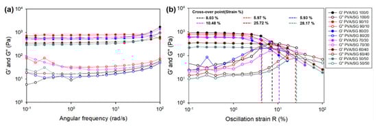 The oscillation frequency sweeps were conducted with the range of 0.1–100 rad/s at a shear strain of 0.5% to measure the viscoelastic properties of the hydrogels. All PVA/SG hydrogels exhibited higher G′ values than G″ values, suggesting that the form of these hydrogels existed in the gel state during the measurement (Figure 3a). In the viscoelastic region from 0.1% to 1%, the G’ value of the hydrogel showed a tendency of increasing with the increase in the PVA concentration (Figure 3b). It was revealed that this tendency correlated to the swelling ratio of the hydrogel because the compact network of the PVA without polysaccharides could be broken by the incorporation of SG. The cross-over point of the hydrogels suggested that the gel network was disrupted and converted from a gel-state to a sol-state at this strain. The PVA/SG 50/50 hydrogel showed the highest cross-over point, indicating that the PVA/SG 50/50 hydrogel had the best elasticity and flexibility among the measured hydrogels. These results were consistent with previous reports that hydrogels with high elasticity and flexibility had high swelling capacities [35,36].