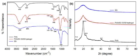 (a) FTIR spectra and (b) XRD patterns of the PVA, PVA/SG 50/50 hydrogel, and SG.