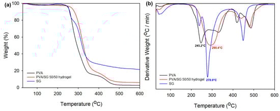 (a) TGA and (b) DTG curve of the PVA, PVA/SG 50/50 hydrogel, and SG.