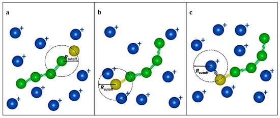 All CGMD simulations were performed using the open-source Large-scale Atomic/Molecular Massive Parallel Simulator (LAMMPS [21]). Periodic boundary conditions were imposed in all directions. The Murat–Grest bead–spring model [22,23,24,25] was used to describe homopolymer chains consisting of neutral beads (A type), templates of negatively charged beads (C type), positively charged monomer beads (B type), initiators (I), and counterions. The van der Waals and electrostatic interactions were modeled by the Lennard–Jones (LJ) and Coulombic potentials, respectively. The bonded interactions were modeled using the finitely extensible nonlinear elastic (FENE) potential [22]. The simulations were performed using dimensionless units. A bond stiffness (k) of 25ε/σ2 (where ε and σ are the LJ parameters, both set equal to 1) and a maximum bond extension distance (r) of 1.5σ were used. The solvent was implicitly treated via the Langevin thermostat [20]. The long-range electrostatic interactions between the charged beads were handled using the particle–particle particle–mesh (PPPM) method [26] with Bjerrum length lB = 1. The real-space cutoff was set to 5.0σ. Different cut-off distances in the LJ potential were used [9,20] to describe the interactions between beads. C–C and monomer-monomer interactions were considered attractive with rcij = 2.5σ. All the other interactions were considered repulsive with rcij = 21/6σ.