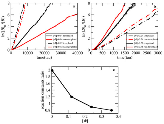 Pseudo-first-order kinetic plot of templated and non-templated polymerization for the synthesis of A51B20 diblock copolymers at total solution concentrations of (a) [Φ] = 0.04, 0.12 and (b) [Φ] = 0.24, 0.36. (c) The ratio of reaction constants of the templated to non-templated polymerization at different [Φ]. The template is a C20 chain. Error bars represent standard deviation.