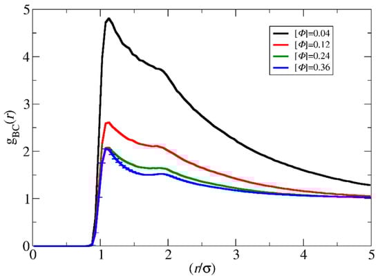 As can be observed, the polymerization rate in the templated reaction at [Φ] = 0.04 is much faster than in the non-templated polymerization (Figure 3a,c). This is in full agreement with the experimental results of Bos et al. [13] reported for similar concentrations. The increase to [Φ] = 0.12 increases both the reaction rates. However, the ratio of the rates of the two polymerization types becomes much smaller. Further increase to [Φ] = 0.24 and 0.36 (Figure 3b,c) leads to the opposite result, i.e., the non-templated polymerization rate becomes higher than the templated polymerization. This is in full agreement with the experimental results by Ding et al. [14] for concentrations of 16% and 50% w/w (coacervate in water). Since the reaction probability in the simulations is constant in both cases, the local monomer concentration before the polymerization takes place may be a clear measure of the complex dependency of the polymerization rate on the concentration. To quantify the local monomer concentration in the templated polymerization, the radial distribution functions g(rCB) of the template and the monomer beads were calculated from two hundred simulation snapshots obtained by a trajectory of one million time steps after the initial equilibration (Figure 4). Three independent simulations of the mixture with [Φ] = 0.36, each one starting from a different initial configuration, were used for the calculation of the standard deviation of g(rCB). The integration of g(rCB) up to a radius of ca. 3.5σ yields the number of B-type beads that surround each C-type bead. From this number, the local concentration of monomers within the spherical volume with this radius can be computed. For the non-templated polymerization, the calculation of the local concentration of monomers is straightforward because the system is homogenous without template beads and is equal to the total monomer density in the simulation box.