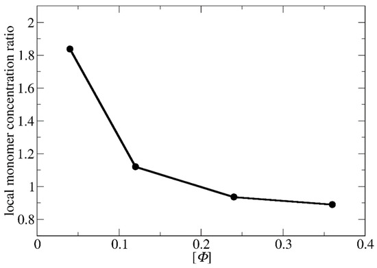 As shown in Figure 5 and Table S2, the ratio of local monomer concentrations of the templated to the non-templated polymerizations decreases with the total concentration in a similar way as the ratio of polymerization rate constants decreases with [Φ] (Figure 3c). This shows that the local concentration may be the key parameter for understanding the variation of polymerization rate with the concentration. At [Φ] = 0.04, the local concentration of the monomers around the template is two times higher than the respective of the non-templated solution, accelerating this way the templated polymerization. The difference in local monomer concentrations for the two types of polymerizations decreases at [Φ] = 0.12. Nevertheless, the local monomer density in the templated polymerization is always higher, leading to a higher polymerization rate. At the most concentrated systems ([Φ] = 0.24 and 0.36), the LJ interactions have a strong impact on the templated polymerization rate. The repulsion between the template and the monomers prevents them from coming close, and thus, both the local density and the polymerization rate in the templated reaction become smaller than in the non-templated reaction.