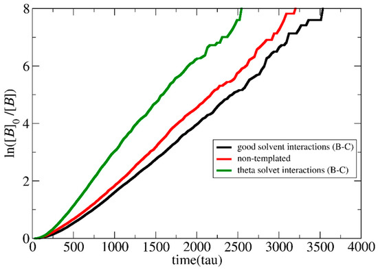 To study the effect of LJ interactions, separate simulations with the LJ interaction parameters set to εBC = 1, εBB = 1.5, and εCC = 1.5 at T* = 3.0 were performed at [Φ] = 0.24. In this way, the B–B and C–C type interactions remain in bad solvent conditions as previously, but the B–C interactions correspond to theta solvent for the neutral chains [9]. As shown in Figure 6, the templated polymerization rate becomes much higher than in the non-templated case since both the neutralized template and the monomers prefer to be close to each other, increasing the local concentration around the template.