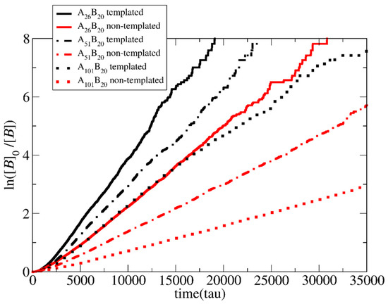 The effects of chemical feedback on the polymerization rate when the neutral chain length varies from 25 to 50 and 100 A-type beads for both templated and non-templated reactions were studied for the lowest concentration ([Φ] = 0.04). In all cases, the target length of the B-type block for the copolymers was fixed, i.e., A26B20, A51B20, and A101B20.