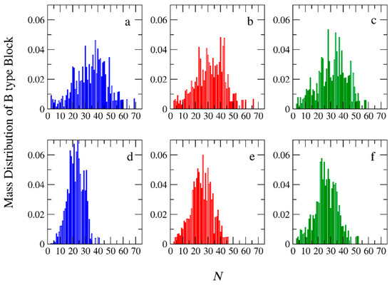 where wA and wB are the ratios of the number of beads of the A and B block to the total number of beads in the diblock copolymer, respectively. Figure 10a,d show the PDIB and Mw as a function of [Φ], respectively. As can be observed, in the templated polymerization, the increase in the concentration decreases both the PDIB and Mw. In the non-templated homogeneous polymerization, the trend is the opposite; both PDIB and Mw increase with [Φ]. At [Φ] = 0.24, the difference between the PDIB values for the two types of polymerizations becomes very small. Using the experimental values ( = 1.10 and = 1.2) of Ding et al. [14], which are the same for both types of polymerizations at [Φ] = 0.5 in Equation (2), we predicted that the = 1.2. This value is close to the simulation mean value of 1.26 at [Φ] = 0.24.