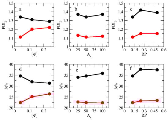 Our simulation results show that the difference in the PDIB values between templated and non-templated polymerization at [Φ] = 0.04 is significant, which is in full agreement with the simulation results of Gavrilov et al. [15] for PISA polymerization. They found that the polydispersity of the diblock copolymer varies from 1.07 to 2.15 as the strength of the interactions between moieties is changed. However, no direct comparison with the experimental results can be performed because Bos et al. [13] do not report the PDIB values for the non-templated polymerization. PDI and Mw as functions of the A-type block length are presented in Figure 10b,e, respectively, for [Φ] = 0.04. It can be seen that the increase from A26 to A51 leads to a decrease in PDI. This is because the longer neutral chain covers the active end bead of the polymerized B block, preventing the monomers from approaching. The effect of RP on PDI and Mw is presented in Figure 10c,f for [Φ] = 0.04. In the non-templated polymerization, the increase in the RP from 0.125 to 0.25 leads to an increase in Mw and PDI values. However, a further increase to 0.5 has no extra effect on them because the local concentration of monomers around the active polymerization center cannot further increase.
