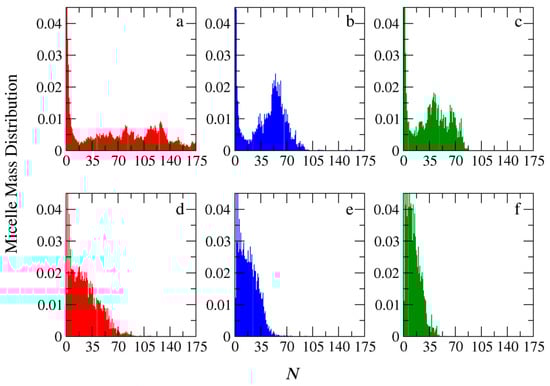 Figure 11 clearly shows that in the templated polymerization, micelles with higher aggregation numbers are formed. Regardless of the micellization method, the increase of the neutral block in the diblock copolymers from A26B20 to A51B20 and further to A101B20 leads to smaller aggregates. This is expected because the increase in the hydrophilic block makes the corona of the micelle bulkier, better protecting the hydrophobic core formed by the complexation of the oppositely charged B and C beads. However, the mass distribution profiles obtained from the PIESA significantly differ from the two-step micellization. In PIESA, the mass distribution profile is a Gaussian-like function (micelles with preferential aggregate numbers are formed as shown in Figure 11b). The deviations from the Gaussian function Figure 11a,c can be attributed to the difficulties in the equilibration arising from the smaller neutral block and the higher Mw of PIESA chains, respectively. In sharp contrast, the mass distribution profiles obtained from the two-step micellization do not reveal preferential aggregation [9] (decaying function with N, Figure 11d,e,f). The evolution of micelle mass distribution with the time in the templated polymerization is presented in Figure S2 for the mixture of A51B20 + C20. Initially, small micelles are formed; then, progressively, the aggregation number of micelles increases, which is in agreement with the TEM results presented in Figure S19 of reference [14]. After completion of the polymerization, the size rearrangements lead to the Gaussian-type distribution presented in Figure 11b. Snapshots of the simulation box are presented in Figure S3 for the same mixture at concentrations [Φ] = 0.04 and 0.36 and different simulation times (τ). It can be seen that the micelle size evolution with the progress of polymerization is in line with the TEM images presented in Ref. [14].