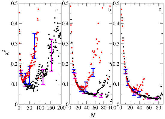 The mean shape anisotropy parameter κ2 of micelles formed by the PIESA (black circles) and by the two-step method (red circles) from mixtures (a) A26B20 + C20, (b) A51B20 + C20, and (c) A101B20 + C20 as a function of the aggregation number N. Error bars represent standard deviation.