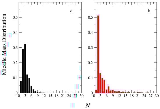 So far in this study, we have focused on micelles formed by mixtures in which the ratio of the charged template beads to the oppositely charged monomers is 1:1. To study the effect of chemical feedback in mixtures with an excess of templated negative beads, simulations were performed at a 2:1 ratio. The mass distributions of the micelles obtained from A101B20 + C40 mixtures are presented in Figure 14 as a function of the aggregation number for both PIESA and two-step schemes. Our results show that, regardless of the micellization method, only very small aggregates are formed (N ≤ 7). This finding is in full agreement with the experimental results of Boss et al. [13], and also agrees with previous theoretical predictions of PCMs being formed only at approximately equal charge stoichiometries [9].