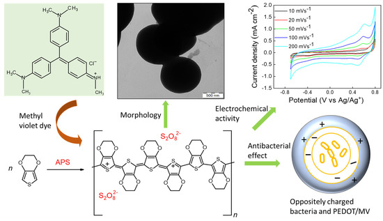 In this article, we have extended our efforts to demonstrate the preparation of PEDOT material with the use of an inexpensive and antibacterial MV dye. This offers a cost-effective and environmentally friendly route to produce highly dispersible PEDOT:peroxodisulfate with spherical morphology, enhanced optical and electrochemical properties. However, the specific mechanism of interactions between PEDOT:peroxodisulfate and an MV dye is a complex research area that needs further research. The MV dye, also dubbed crystal violet, is well known for its medical uses [26], which has been a good motivation for testing its impact on possible antibacterial properties of PEDOT. The current work is focused on both the antibacterial activity and the optical properties of PEDOT tuned with the help of organic dye. Herein, we report the polymerization of EDOT using ammonium peroxodisulfate (APS) as an oxidant in the presence of the MV dye (Figure 1). The influence of dye concentration on the morphology of PEDOT:peroxodisulfate was studied using SEM/TEM. The optical properties of PEDOT:peroxodisulfate were analyzed using UV–vis absorption and PL spectroscopies. A MALDI TOF analysis was conducted to study the effect of the MV dye on the chain length of PEDOT:peroxodisulfate. Raman spectroscopy was employed to examine the presence of the MV dye and its effect on the chemical structure of PEDOT:peroxodisulfate. The thermal behavior of PEDOT:peroxodisulfate in the presence of the MV dye was evaluated using thermogravimetric analysis (TGA). Additionally, the role of the MV in the conductivity and electrochemical properties of PEDOT:peroxodisulfate was determined. Furthermore, the antibacterial activity of PEDOT with the incorporation of an inexpensive dye was accessed. The current work is focused on both the antibacterial activity and the optical properties of PEDOT:peroxodisulfate tuned with the help of organic dye which can enable new prospects for advanced material development for optical sensing and provide antibacterial properties.