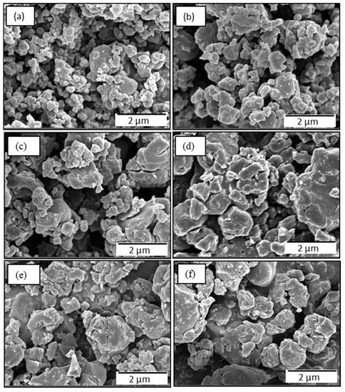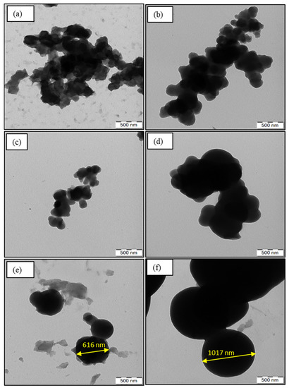 The oxidation of EDOT with APS produces PEDOT:peroxodisulfate in a form of a black powder containing particles of irregular shape (Figure 2a and Figure 3a), similar to the results reported earlier [27,28]. There have been already a few studies published that describe the influence of organic dyes on the morphological properties of PEDOT. Dai et al. demonstrated the synthesis of microtubular PEDOT using methyl orange as a template [29]. Bai et al. achieved the granular morphology of PEDOT along with the formation of channels by the help of Congo red [28]. In this report, we show that the addition of the MV to the polymerization mixture at increasing concentration, with fixed molar ratio of APS/EDOT, results in a gradual formation of spherical pattern (Figure 2b and Figure 3b). The particle size was observed to increase with the increasing dye content. The SEM/TEM micrographs (Figure 2c,d and Figure 3c,d) show the formation of spheres along with the preservation of some irregular pattern, which suggests the consumption of all the dye during polymerization. However, further increasing the dye concentration results in a higher number of spherical particles due to the adequate dye available for the polymerization and thus converting all irregular PEDOT:peroxodisulfate to dye-induced spheres (Figure 2e,f and Figure 3e,f). The TEM micrographs clearly show the diameter of a sphere in the range of 600 nm (Figure 3e), which can reach up to ~1100 nm with the further increase in the MV concentration (Figure 3f). The spherical morphology of PEDOT:peroxodisulfate/MV can be predicted by the interactions between the PEDOT:peroxodisulfate and MV, which in turn affects the optical properties of materials. The hydrophobic aromatic group of the MV tends to combine with EDOT molecules by π–π bonding and hydrophobic interactions [28].