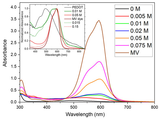 The investigation of optical properties, which were examined using UV–vis absorption and PL spectroscopies, play an important role in the fabrication of various optoelectronic devices. In order to examine the solution processability of PEDOT, solvents with different polarity were used. The polymers were found to be insoluble in hexane, chloroform, methanol and water. However, in high boiling solvents, such as the DMSO and N-methyl-2-pyrrolidone, PEDOT dispersions can be obtained. To understand the influence of the dye on the optical properties of PEDOT:peroxodisulfate, UV–vis absorption and PL spectroscopies were performed on samples dispersed in DMSO. The absorption spectrum of pristine PEDOT:peroxodisulfate presented in the inset of Figure 4 was found to be consistent with previously reported data [30]. Here, the broad absorption band ranging from 400 to 700 nm, with a maximum at 511 nm, corresponds to the π–π* transition [31], whereas the tail extending beyond 700 nm has been assigned to polaron and uncoupled bipolaron transitions [32]. The neat MV dye and the PEDOT:peroxodisulfate with higher MV concentration have the main peak located at 600 nm [33] with a shoulder around 560 nm originated in the optical transitions in the MV. The peak at 600 nm can be attributed to the molecularly dissolved dye, whereas the shoulder at 560 nm is related to the formation of H-aggregates of the dye [34]. With the dye concentration decreasing, the shoulder at 560 becomes suppressed and the PEDOT:peroxodisulfate band centered at 511 is increased. The H-aggregates refer to the ordered arrangements formed through the self-assembly of the MV molecules, where the dye molecules come together via intermolecular π–π stacking interactions. The presence of H-aggregates is evident from the sharp absorption band observed at 560 nm, and as the MV dye content increases in PEDOT:peroxodisulfate, there is a corresponding increase in the intensity of the absorption peaks at both 560 nm and 600 nm. The formation of H-aggregates implies a higher level of molecular organization and stacking within the PEDOT:peroxodisulfate, following the self-assembly and stacking of the MV dye molecules. There are unique properties possessed by H-aggregates such as shifted absorption peaks and enhanced light absorption in comparison to individual dye molecules. These characteristics are attributed to the unique organization and interactions of the aggregates. The presence of H-aggregates in the PEDOT:peroxodisulfate/MV reveals the presence of ordered assemblies of the MV dye molecules in the system, which in turn leads to tailored optical properties. [35,36]. As can be seen from the two examples in the inset of Figure 4, the composites spectra can be constructed from their two components. By fitting the composites spectra using their best ratio, the real fraction of the MV in the composites was determined and is shown in Table 1. This would not be otherwise possible due to the removal of the dye during product purification. Compared to simulated spectra, the real absorption bands are broader, and the absorbance rises towards the UV region, pointing to aggregate formation and corresponding to the increased light scattering. This is also in good agreement with the Raman results.
