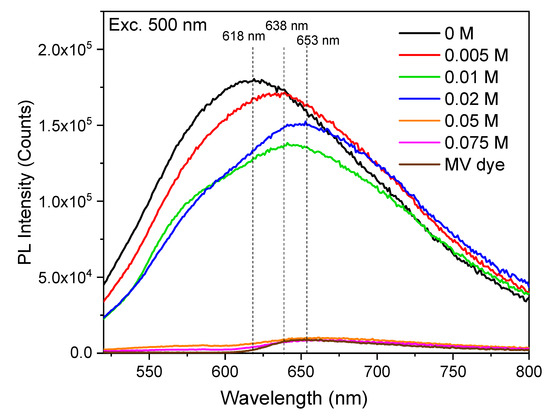 The PL spectrum of PEDOT:peroxodisulfate shows a broad emission band in the visible region with the maxima at 618 nm when excited at 500 nm (Figure 5), which is in good agreement with a prior report [37]. The introduction of the MV results in an increase in the emission intensity for 0.005 M MV, which can be attributed to the easy charge recombination between the PEDOT:peroxodisulfate and the dye molecule. The MV at 0.01 and 0.02 M concentrations shows also the second peak at 638 nm, attributed to the MV. As suggested in the literature [38], the decrease in fluorescence intensity with the increase in dye concentration and the spectrum becoming similar to the dye itself at higher concentration suggests self-quenching as dye molecules pack closer or the formation of a non-fluorescent H-dimer at higher concentration. There is, however, a much more trivial explanation that the fluorescence quenching is caused by reabsorption of emitted light by the MV with much higher extinction coefficient and much lower fluorescence quantum yield.