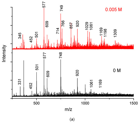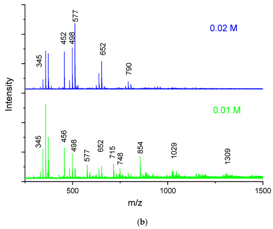 MALDI-TOF mass spectra of PEDOT:peroxodisulfate prepared in the presence of (a) 0 M and 0.005 M, (b) 0.01 M and 0.02 M MV dye.