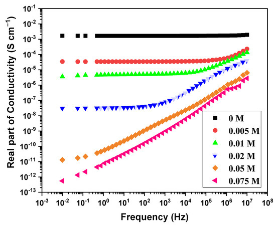 The conductivity of PEDOT:peroxodisulfate decreases markedly with the increase in dye concentration (Table 1). The π–π interaction, ionic interaction, hydrogen bonding and hydrophobic interaction between the dye and the polymer chains are the most common interactions reported in the literature [40]. With the increase in dye concentration, the π–π interaction is dominated by the hydrophobic interaction which helps to form self-assembled H-aggregates, as evident in the TEM images. These large bulky aggregates with limited mobility show dispersive nature even at low frequencies (Figure 7). It is well known that dye resembles surfactants and aggregates to micelles, which are adsorbed on the polymer chains hindering the formation of the well-ordered arrangement of the conductive path [41].