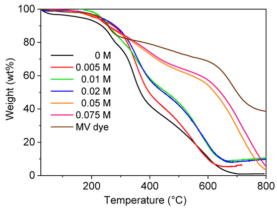 The thermal behavior of PEDOT:peroxodisulfate in the presence of the MV dye was investigated (Figure 8). PEDOT:peroxodisulfate with or without dye shows stability up to 200 °C with 5–10 wt% loss corresponds to release of moisture content and protonating acid. The decomposition of PEDOT:peroxodisulfate is completed around 700 °C, whereas the PEDOT:peroxodisulfate in the presence of low concentrations of the MV, 0.005, 0.01 and 0.02 M, shows a residual weight of ~10 wt%. This can be associated with the neat MV, which itself displays the residue of ~37 wt%. Further, on increasing the concentration of MV to 0.05 and 0.075 M, PEDOT:peroxodisulfate exhibits complete decomposition. This variation in the thermal behavior with an increase in the amount of dye can be attributed to the different morphology of PEDOT:peroxodisulfate (Section 3.1), as the spherical morphology of the PEDOT:peroxodisulfate was obtained due to sufficient dye available in the polymerization mixture for high concentrations of the MV in comparison to the 0.05, 0.01 and 0.02 M concentrations where mixtures of irregular and spherical patterns were observed. The TGA analysis of the MV dye in the air atmosphere where the weight loss observed between 200 and 290 °C indicated the evolution of H2 and subsequent oxidation of hydrogen into H2O. Additionally, the weight loss observed between 300 and 600 °C was likely due to the oxidation of organic carbon and nitrogen, resulting in the production of CO2 and NO2 [42]. A previous study has reported residual weights of 30 wt% for methyl orange and 20 wt% for Acid Blue 25 in the TGA analyses of organic dyes. These residual weights likely consist of non-volatile components [43].