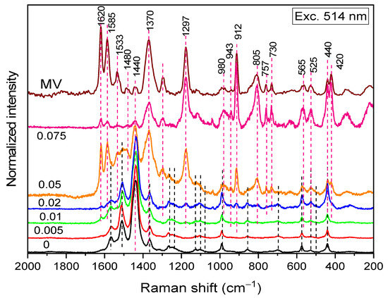 Raman spectra of PEDOT:peroxodisulfate prepared at various MV concentrations were measured with 514 nm excitation to detect the signal of the MV (Figure 9) (both MV and PEDOT Raman signal is (pre)resonantly enhanced, the enhancement being much stronger for MV). The dye has been detected at the lowest concentration of 0.01 M. The spectrum of the PEDOT:peroxodisulfate prepared at the highest dye concentration, 0.075 M, reflects mainly the MV with only minor peaks of PEDOT. No peak position shifts were observed; however, the C—C stretching band of the phenyl and quinonoid rings of MV at 1620 and 1585 cm−1, respectively, decreased in intensity dramatically. This is probably connected with the change in the resonance conditions in the composite compared to those in the neat dye (measured as a powder, i.e., with its molecules stacked).