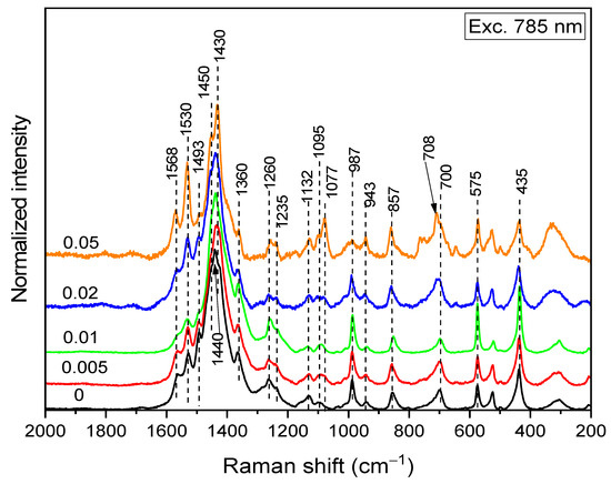 The Raman spectra excited with the 785 nm laser line reveal the state of the PEDOT:peroxodisulfate fraction in the composite (Table 2), as the MV dye is out of resonance with this line (Figure 10). The spectra of the samples with higher MV concentrations were, however, overlapped with MV fluorescence (and were thereby baseline corrected). The spectrum of PEDOT:peroxodisulfate prepared at the highest dye concentration, 0.075 M, was completely obscured by the fluorescence and is not presented. With increasing MV concentration, the intensity of the C=C stretching peak connected with the moderately-doped structures (polarons) at 1440 cm−1 decreases, while the intensities of the C=C stretching peak connected with both neutral (1530 and 1430 cm−1) and highly doped (bipolaron, 1450 cm−1) structures increase. Intensity changes were also observed for the bands connected with the oxyethylene ring, which also belongs to the charge-carrier delocalization system: the band at 1077 cm−1 increases, while the band at 987 cm−1 decreases. The maximum of the symmetrical C—S—C deformation band shifts from 700 to 708 cm−1. These changes indicate the coupling of the polarons into bipolarons induced by the elongation of the PEDOT:peroxodisulfate chains in the presence of MV.